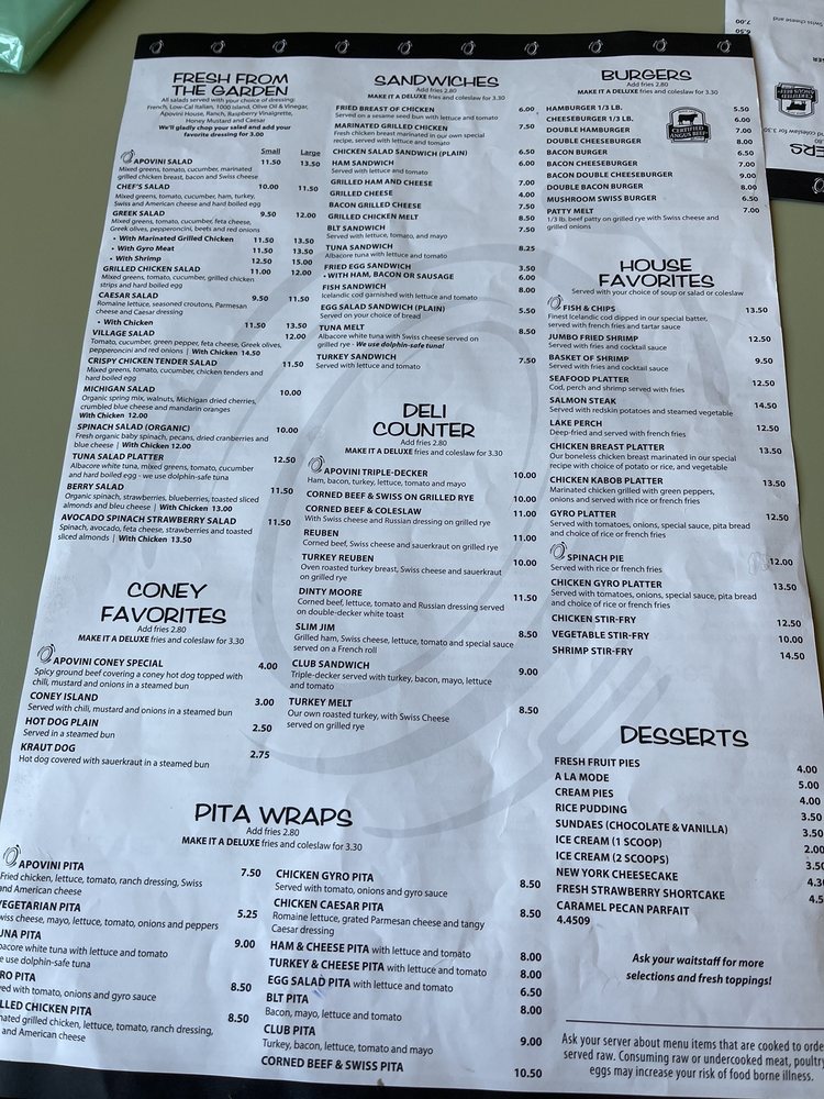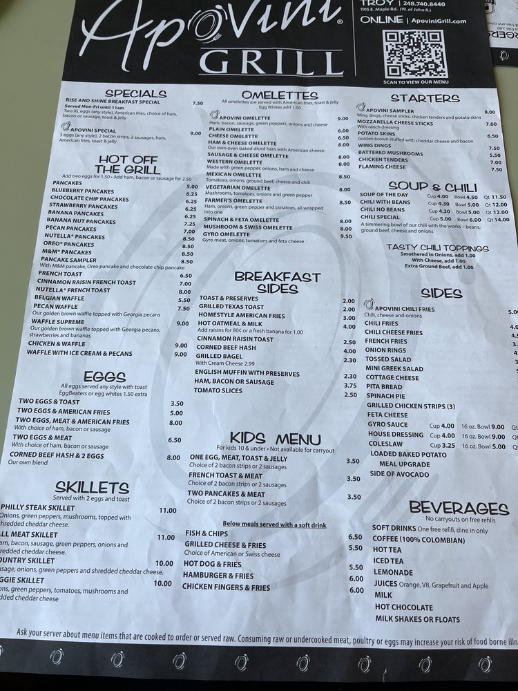 Apovini Grill, located in Clawson, MI, offers a variety of American deli dishes perfect for breakfast, lunch, and dinner. From their Apovini Sampler starters to their Rise and Shine Breakfast Special, the menu is full of delicious options. Customers rave about the friendly service and family-run business vibes, making it a staple in the area for over 20 years. The Greek Chicken Salad and chicken pita are must-tries, with juicy grilled chicken and homemade dressing. While some find the prices a bit steep, the quality and portion sizes make it worth it. The cozy atmosphere and attentive staff add to the overall dining experience at Apovini Grill. Whether you're craving pancakes, French toast, or a hearty salad, this spot has something for everyone.